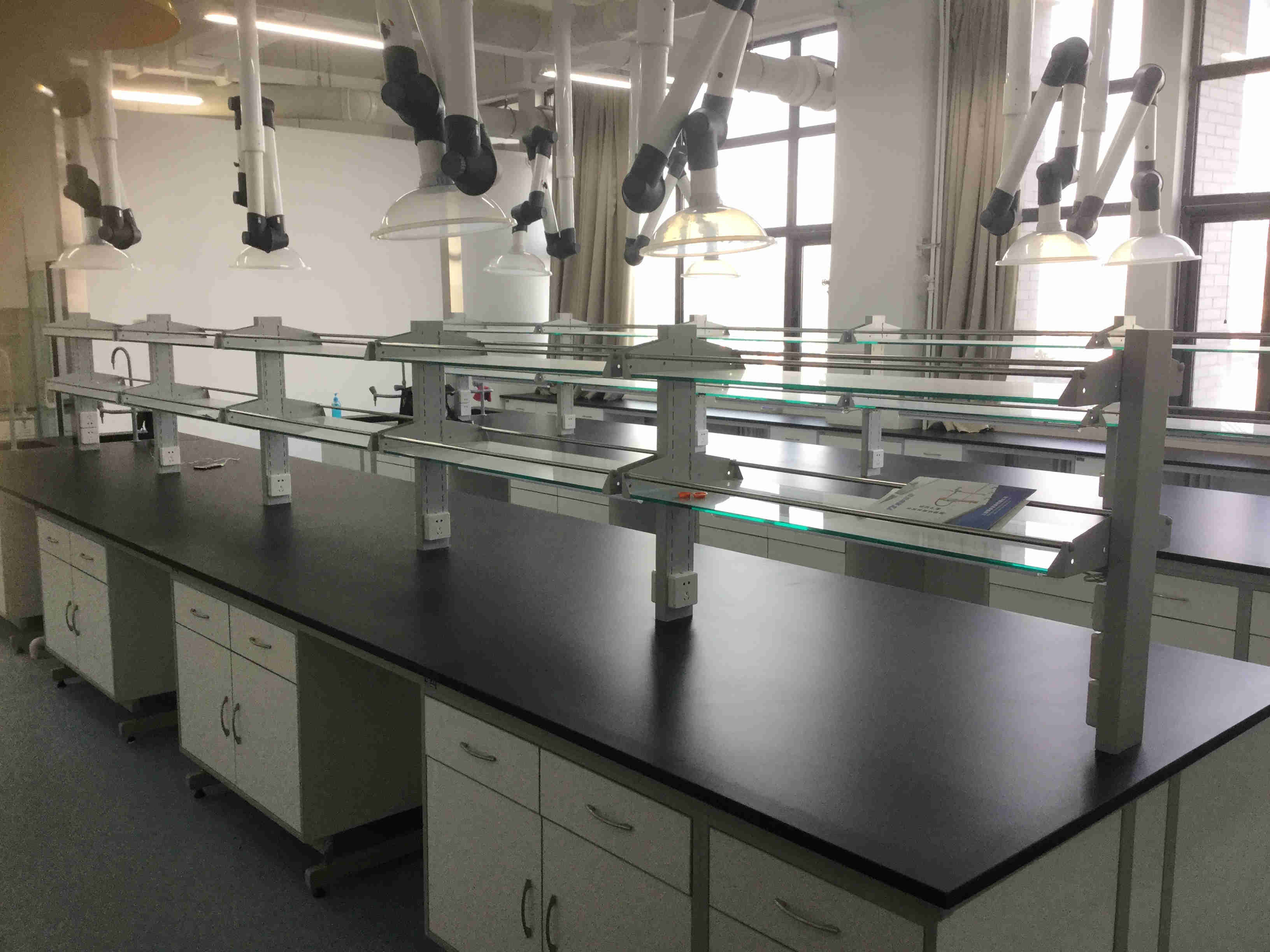 (5)試驗(yàn)臺:主要由臺面、臺下的支架和器皿柜組成,為了方便操作,臺上可設(shè)置樣品架,臺的兩端可安裝水槽。臺面一般寬為750毫米或1500毫米,長度根據(jù)房間尺寸,可設(shè)置為1500-3000毫米,高度一般為800-850毫米,臺面常用貼面理化板、實(shí)心理化板、環(huán)氧樹脂板、千思板、陶瓷板等制成。理想的臺面應(yīng)平整、不易碎裂、耐酸堿及溶劑腐蝕,耐熱,不易碰碎玻璃器皿等。
